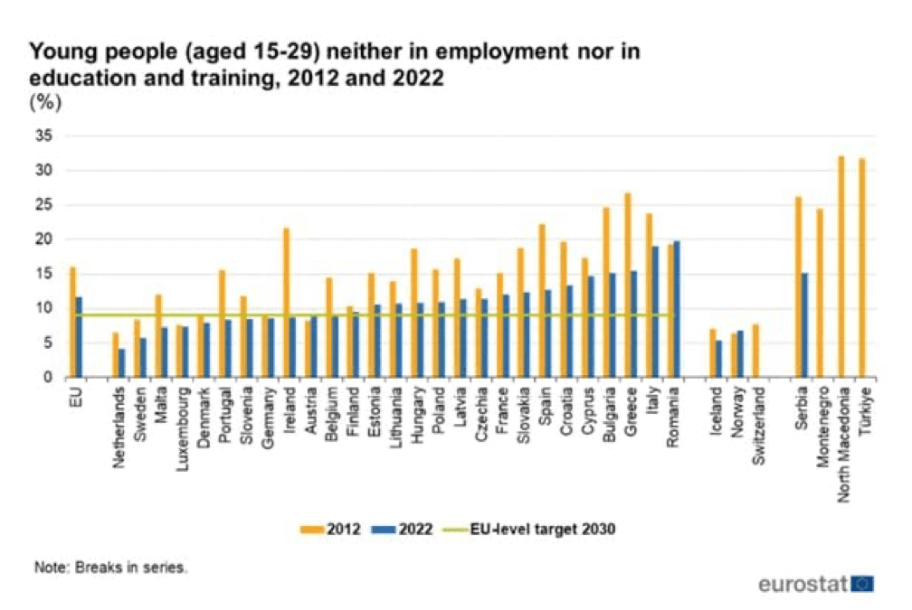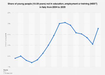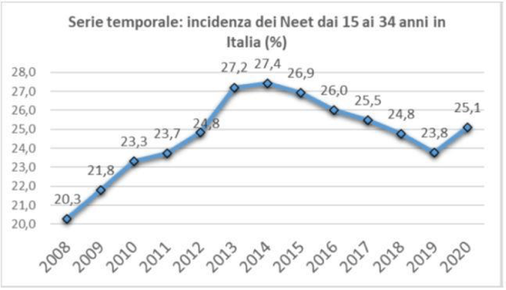 Le statistiche Eurostat riportano che nel 2022, in Italia, 1,67 milioni di giovani (quasi 1 giovane su 5) tra 15 e 29 anni è un NEET, cioè una persona che non studia, non lavora e non è inserito in un percorso di formazione.